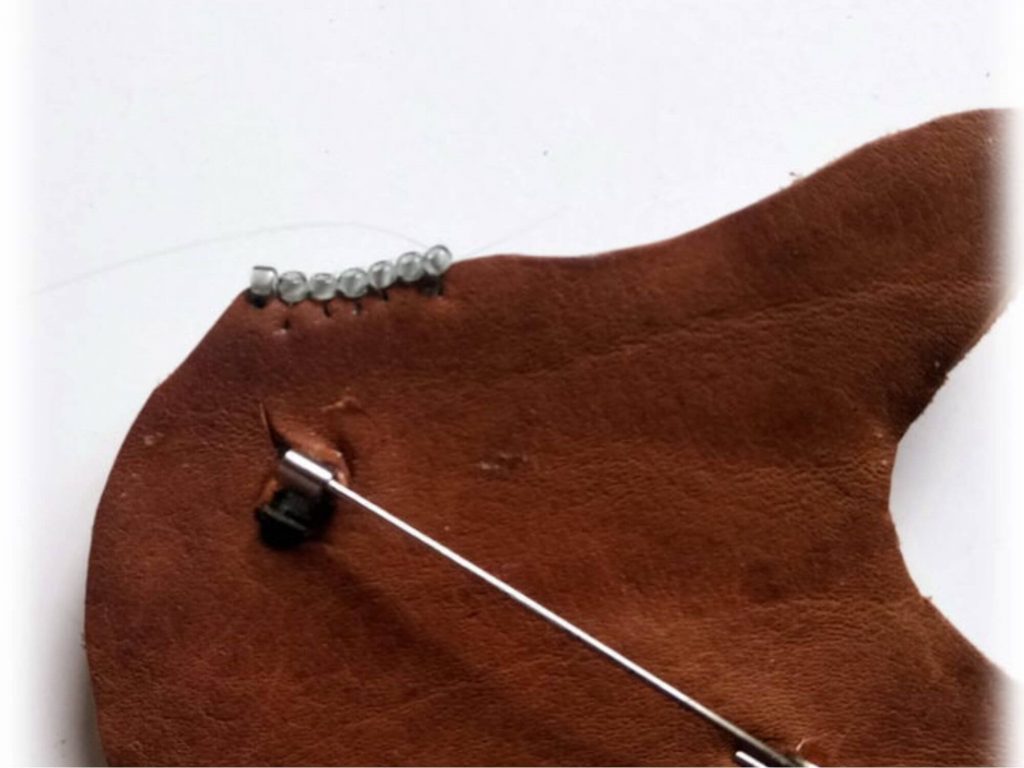 Для этого переворачиваем брошь кожаной стороной к себе, закрепляем между слоями иголку с леской и маленькими стежками пришиваем. Набираем на леску одну бисерину. Прокалываем иглой все слои, выводя её на лицевую сторону. Итак, бисеринка оказывается на изнаночной, кожаной стороне. Вводим в нее иглу и подтягиваем, бисеринка встает ровно в ряд, закрывая край.
