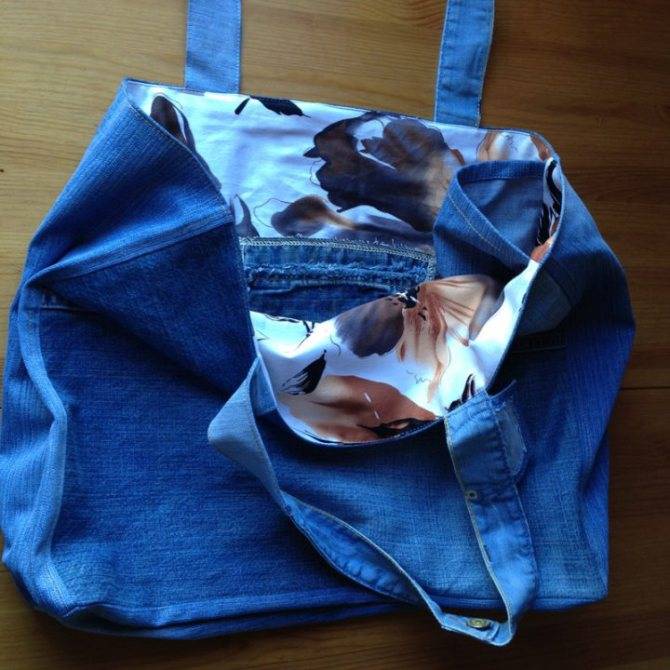 Детали сумки вырезаются из подкладки. Учитываются припуски (1 см). Подкладка пришивается к боковинам и днищу. Из ненужных джинсов вырезается карман. Его прикрепляют изнутри к подкладке. Из оставшейся ткани делают ручки, длиной примерно 63 см. Их ширина должна быть не менее 5 см.