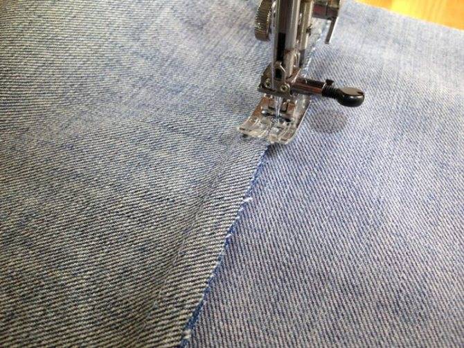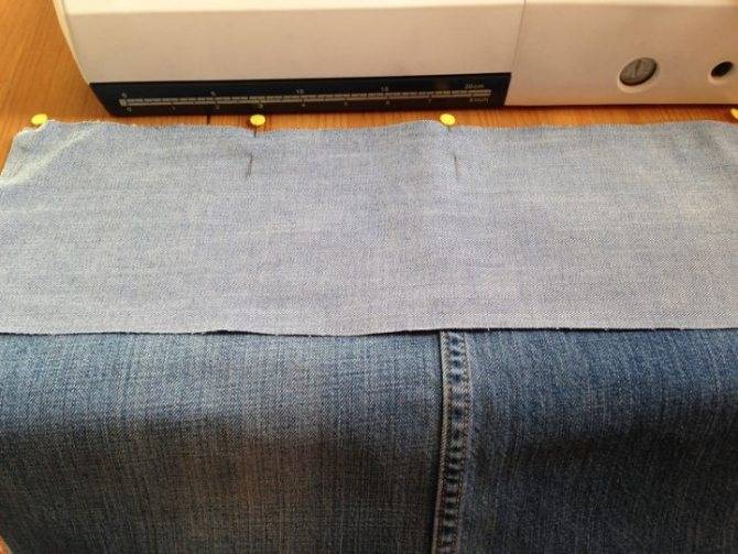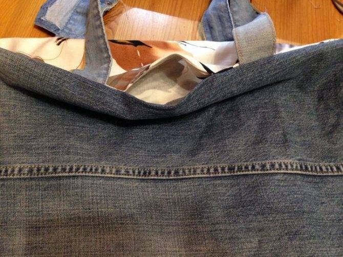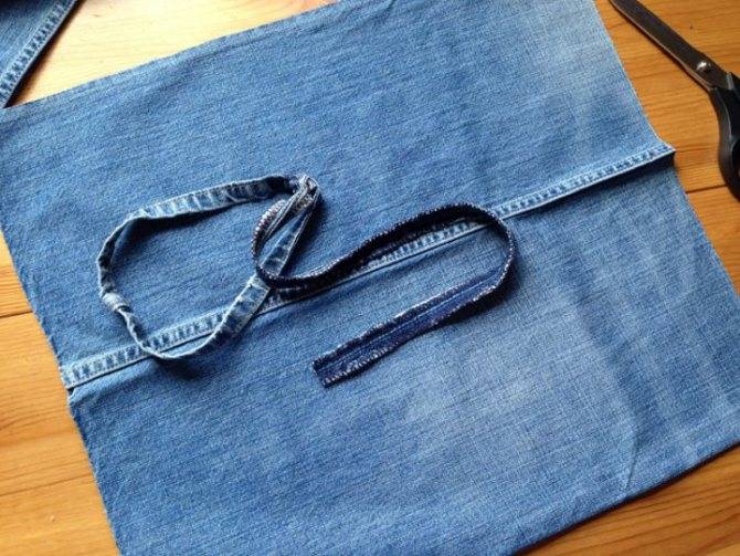 Сначала ножницами отрезается штанина. Желательно 55–60 см. Складываем заготовку, к верхней части прикладываем ремень. Около низа отрезаем часть ремня (более 10 см). Деталь пришивается прямо ко дну со стороны лицевой части. Затем нужно отрезанную штанину вывернуть наизнанку.