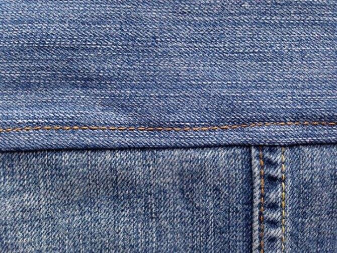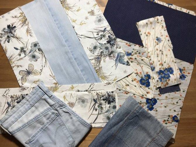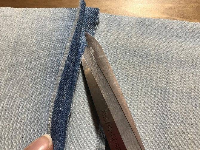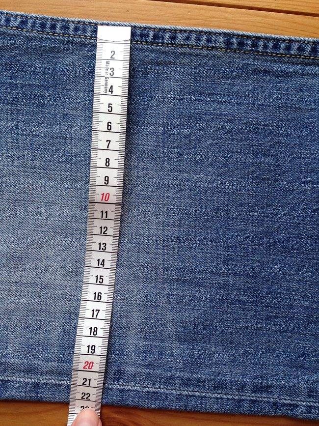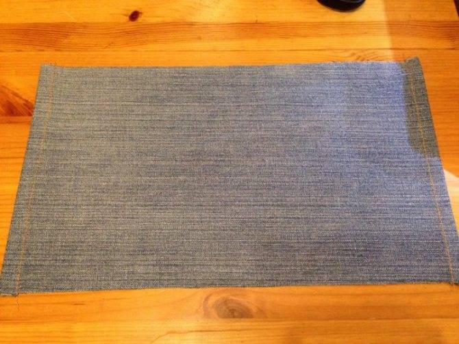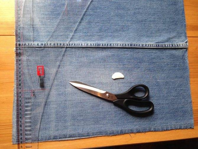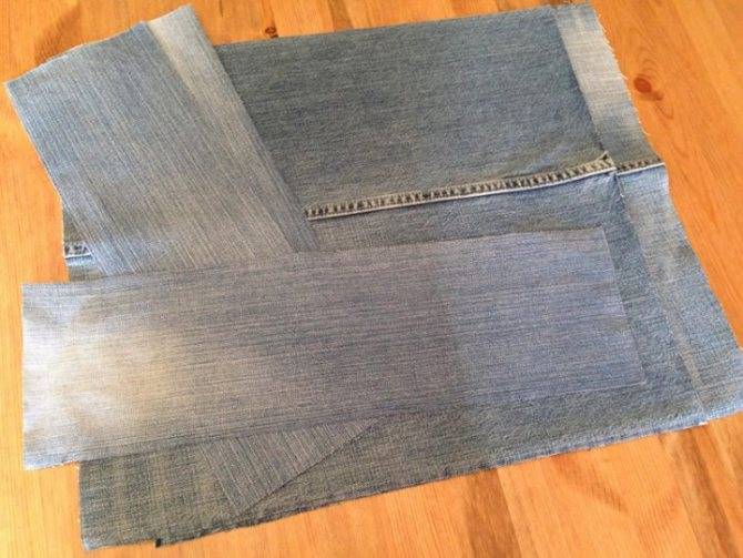 - От джинсов отрезают обе штанины и разрезают пополам.