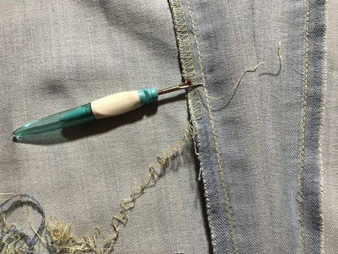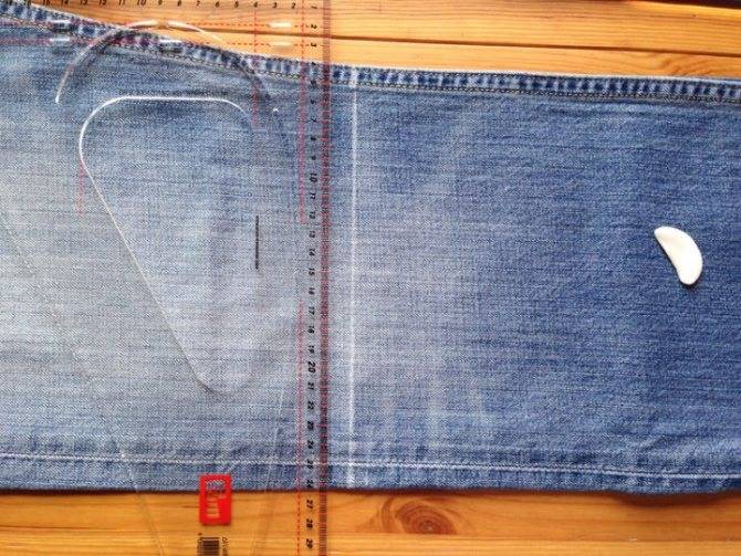 Измеряем ширину джинсов. Для этого передвигаем линейку, пока ширина не начнет меняться. В этом месте останавливаемся и делаем пометку мелом.