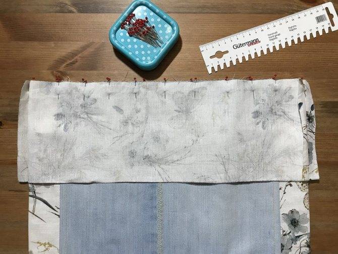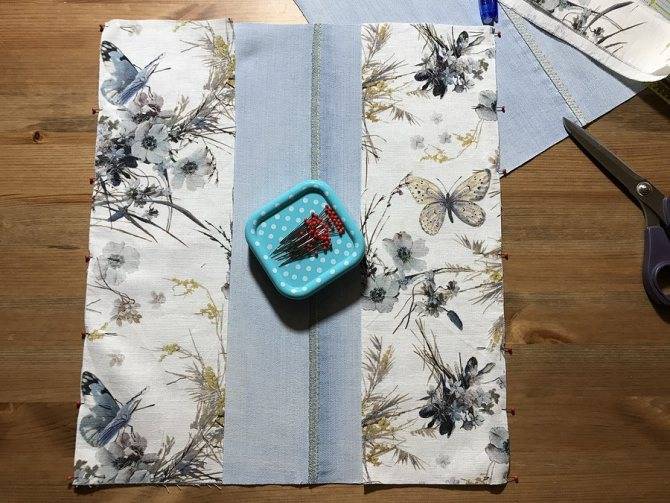 Дополнительную деталь размещаем между основной и боковой частью, прикалываем, стачиваем.