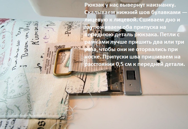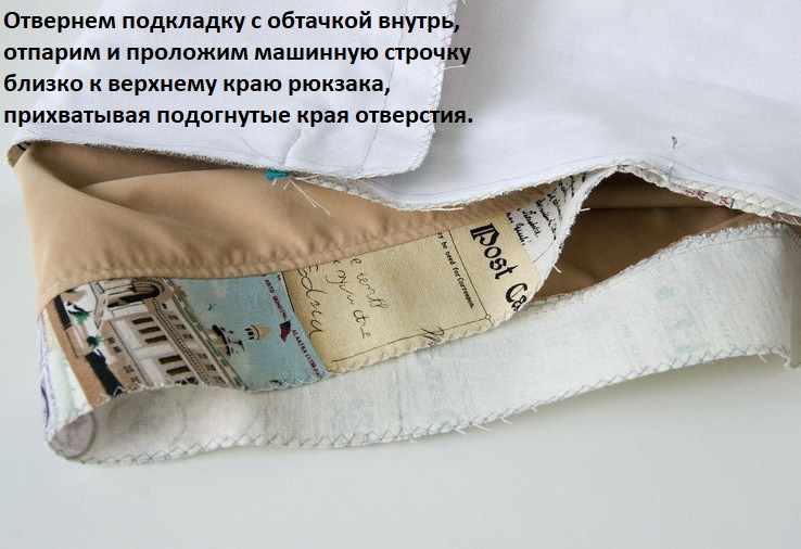 Дно пришивается вручную к краю заготовки. Уголки прикрепляются к нему, учитывая длину строчки. Чем она длиннее, тем уже получится дно рюкзака.