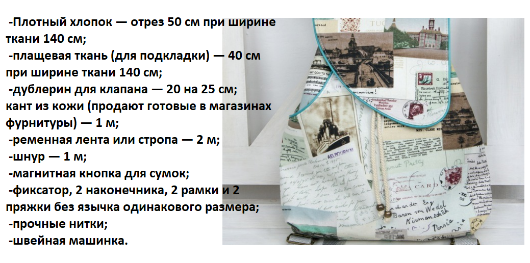 Чтобы сшить сумку-рюкзак, потребуется не очень много времени. Для выполнения работы понадобятся: