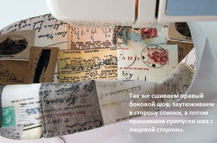 Припуски снизу боковых деталей надсекаем у швов по 1 см, короткие срезы сшиваем с элементами изделия.
