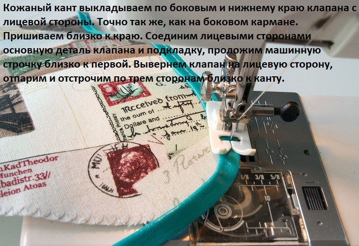 Клапан обрабатываем дублерином. Все срезы обметываем. От ленты ремня отрежьте две части длиной восемь сантиметров. Они понадобятся для закрепления рамок. Края ленты оплавить и обметать. Дальше работаем над наружным карманом.
