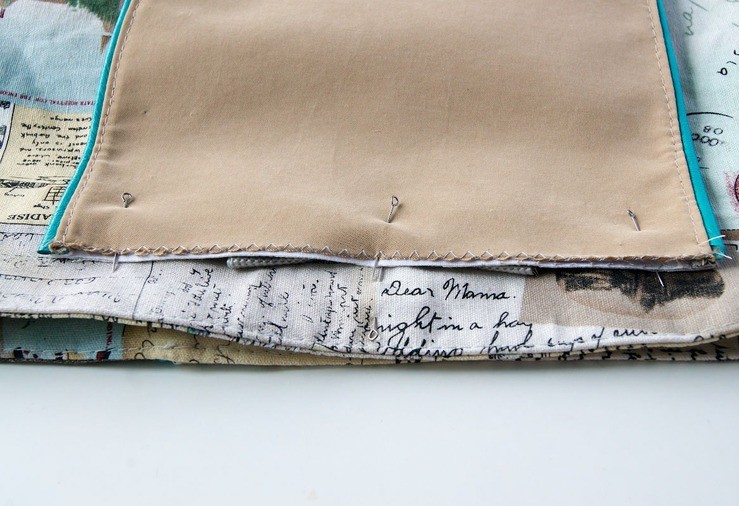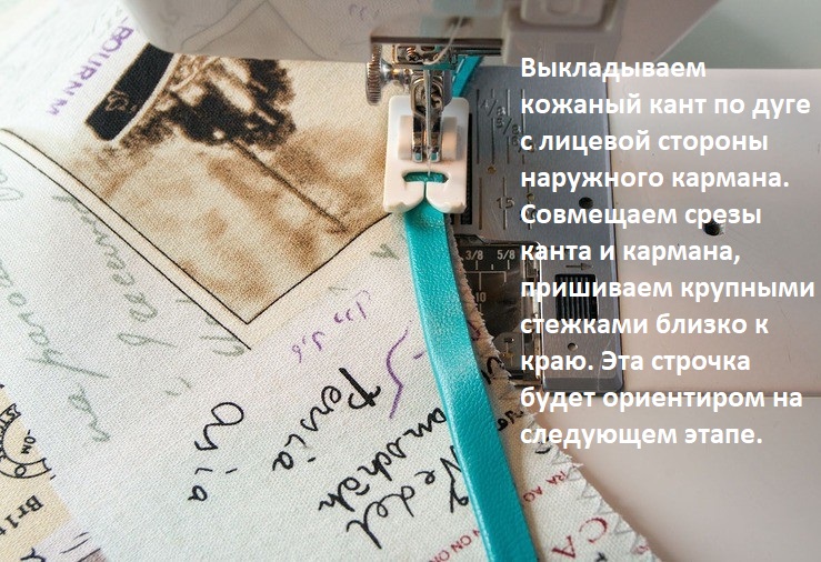 19. Пришиваем подкладку, предварительно сделав наметку вручную. Нюанс: желательно располагать карман на подкладке на противоположной стороне от наружного кармана. 20. В местах соединения ручек с верхним краем нужно еще раз прострочить или сметать.