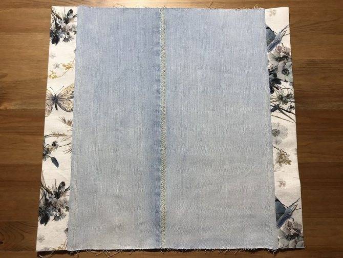 По обе стороны этого прямоугольника пришиваем одинаковой ширины 2 куска материала – это будут боковые стороны нашей сумки. Для этого используйте переднюю часть штанины.