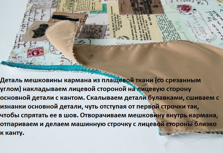 Мы закончили работу с основной верхней тканью. Теперь нужно отшить подклад. Начнем с внутреннего кармана.