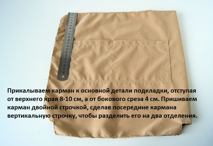 Вырезаем дополнительную деталь для кармана: длина – 43 см, ширина – 22 см.