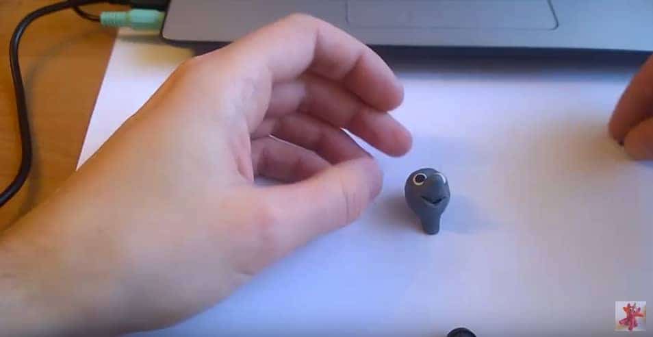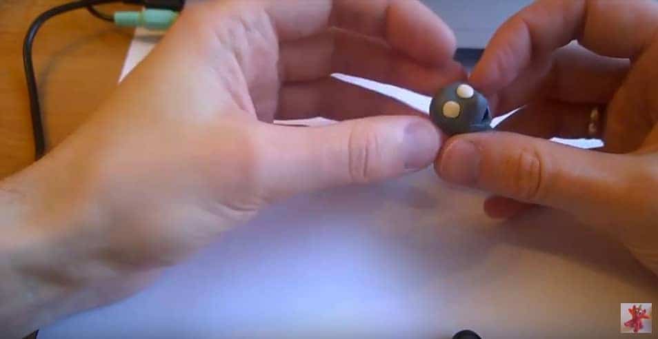 4) На кончик бугорка налепите чёрную капельку — носик. Не стоит использовать в этом случае много пластилина — достаточно капельки, размер которой достигает спичечной головки. Сразу над бугорком приклейте область глаз — белые круглые лепёшки (также размером со спичечные головки).