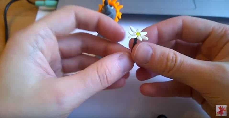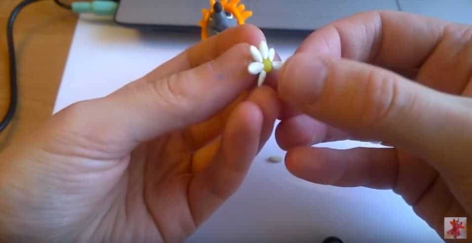 Далее нас ожидает достаточно кропотливая работа, а именно, лепка красивой ромашки – атрибут, без которого невозможно представить мультик «Ежик и медвежонок». Ножку ромашки делаем черной, центр – желтого цвета, а лепестки – белыми.