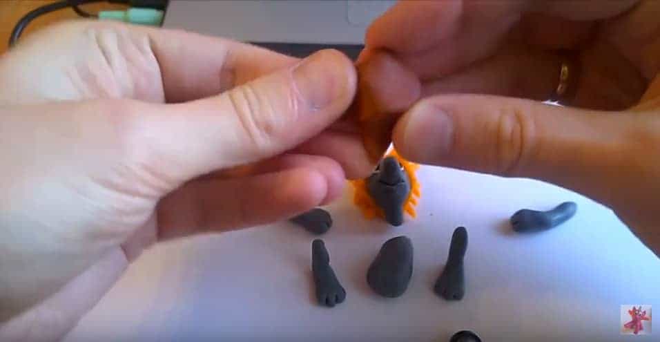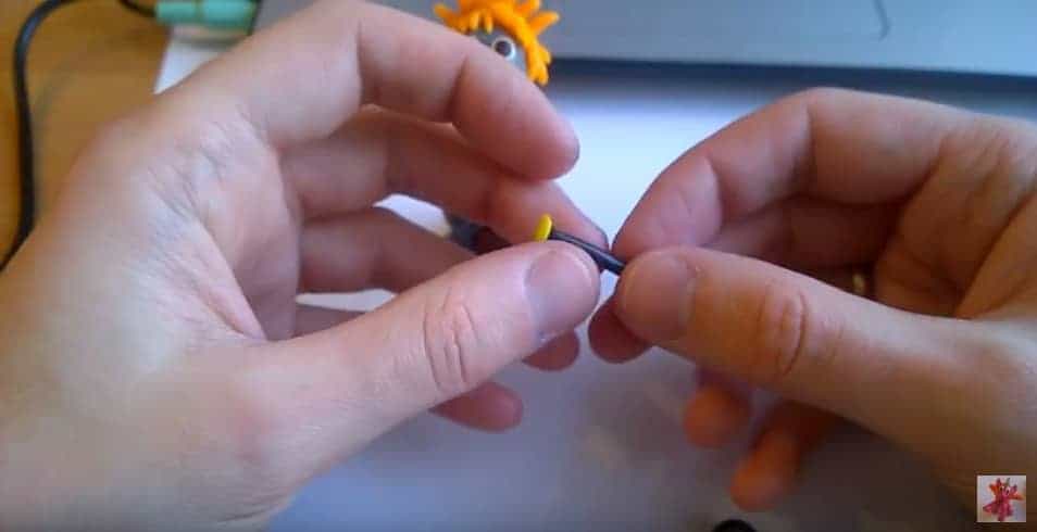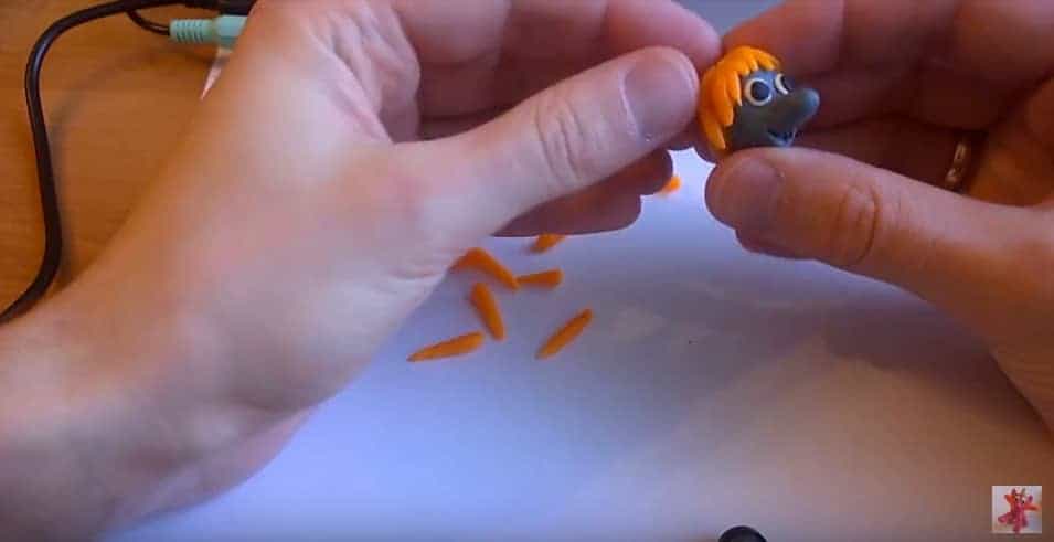 Также из оранжевого цвета сделаем много тонких заготовок, которые будут играть роль иголок на макушке ежика. Аккуратно прикрепим иголки к оранжевой части головы. Прикреплять иголки можно в различных направлениях, главное – получить торчащую во все стороны забавную прическу.