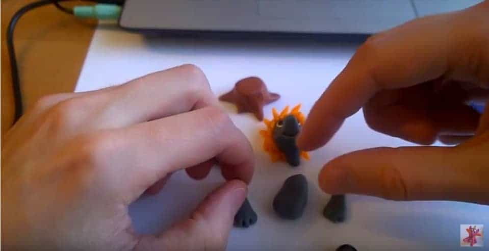 - Затем при помощи коричневого пластилина сделайте четыре маленькие лепешки. Так будут выглядеть лапки ежика. Их также прикрепите к туловищу.