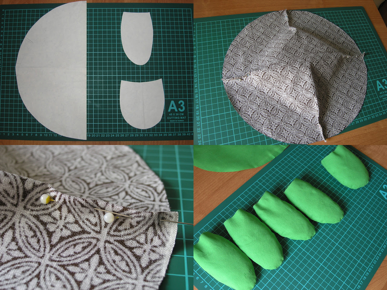 - Сшейте круглые лоскутки, формируя панцирь, оставьте отверстия для набивки и соединения лап и головы.