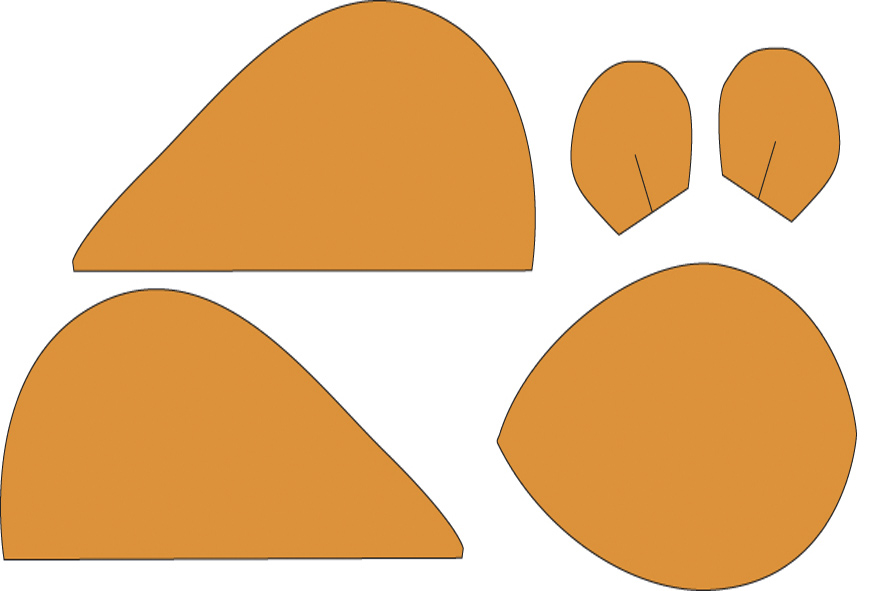 Ее детали парные. Сшейте каждую такую между собой и набейте наполнителем. Только ушки будут плоскими. Внутри вы пришьете такие же детали, но более светлого цвета и меньшего размера. Притачайте хвостик и создайте черты мордочки.