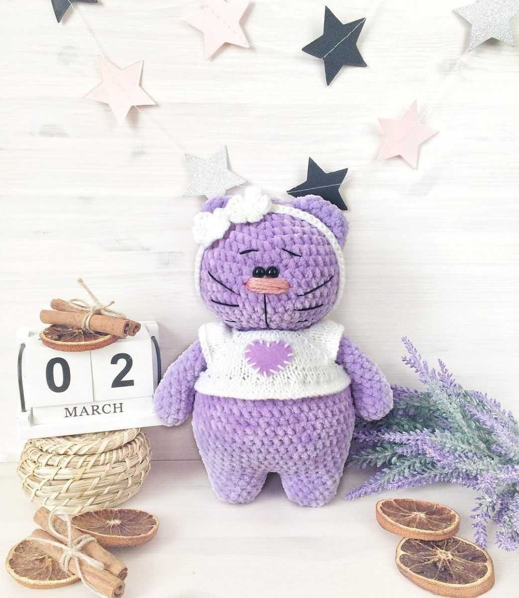 Яркая, но лёгкая в изготовлении игрушка для начинающих – забавный разноцветный котёнок. Выполняется он крючком нитками разных цветов по той же схеме СБН, что и совята, но верх вяжется с помощью последовательных убавлений в каждом ряду, а последние петли сшиваются иголкой в узелок.