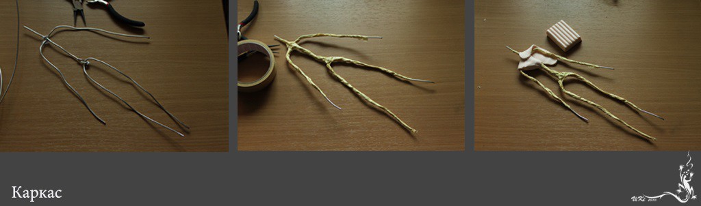 Делаем из проволоки каркас куклы и обматываем его малярной клейкой лентой.