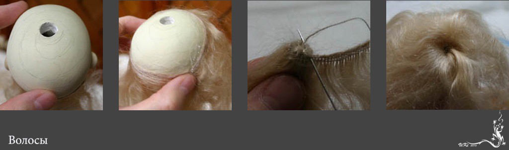 Далее раскатываются тонкие колбаски, из которых будут волосы у куклы. Есть и другой способ: раскатав плоскую овальную фигуру, ножом нарисовать линии и прилепить к голове.