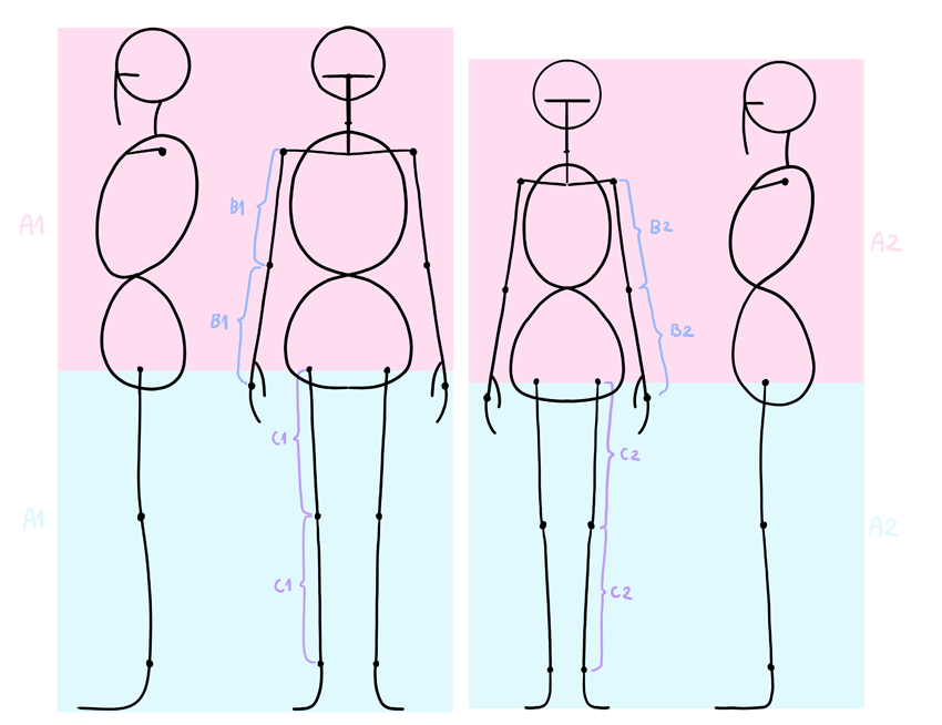 - Как правило, тело у аниме-персонажа можно разделить пополам ровно на уровне промежности. Иногда нижнюю половину делают больше, чтобы ноги казались длиннее, но крайне редко делают наоборот – короче (А).