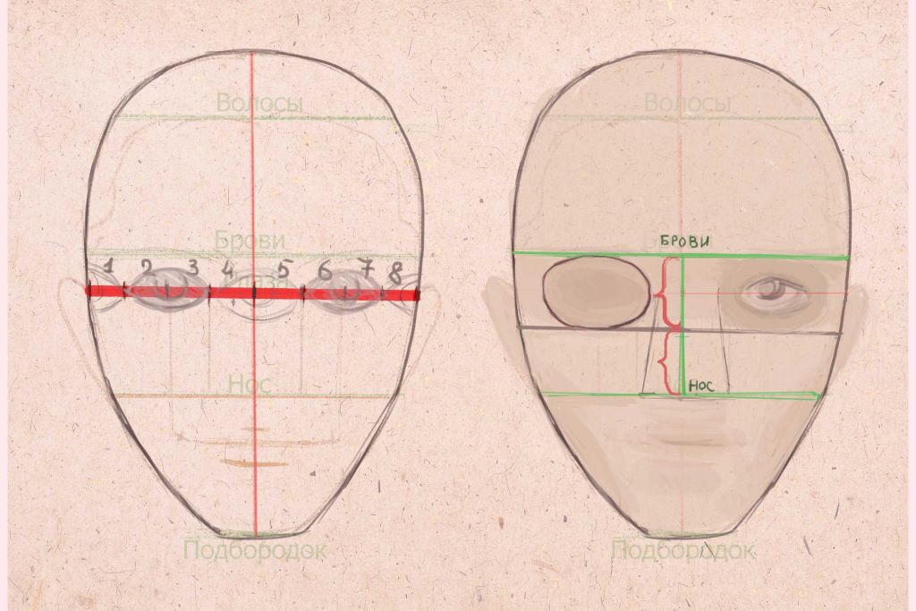 Так, каждый глаз вписываем в 2/8, и между ними оставляем расстояние равное размеру одного глаза (2/8).