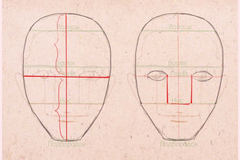 Линия глаз посередине головы, крылья носа на одной вертикальной оси со слезниками