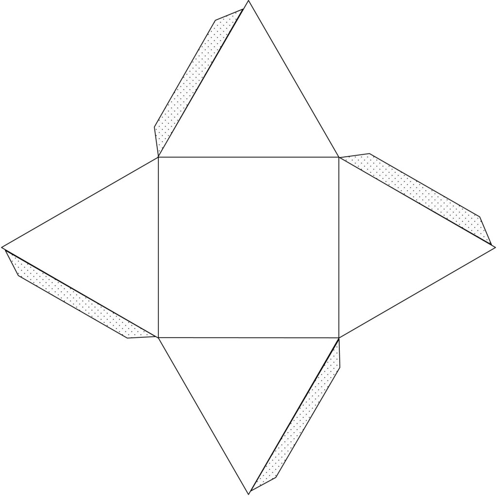 - Заготовки равнобедренных треугольников нужно будет соединить с квадратом с помощью специальных отступов. Стоит не забыть, что вырезать заготовки нужно прибавив к их краям полсантиметра для того чтобы было удобно склеить фигуру.