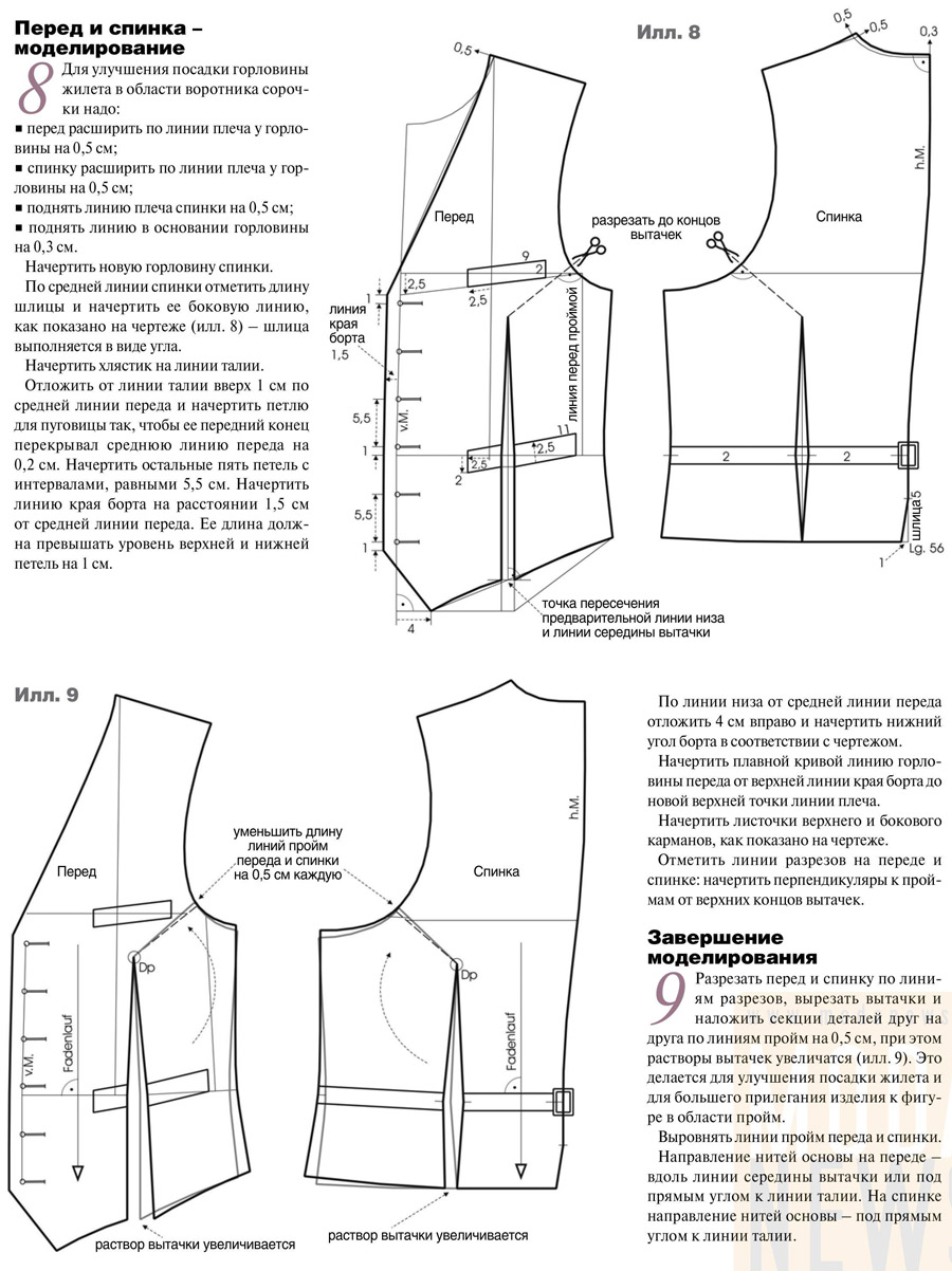 Как и шитье любого другого вида одежды, процесс пошива жилета начинается с построения выкройки. Для ее создания используется выкройка основы платья или жакета, пальто. В отличие от контуров базовой выкройки, при моделировании жилета, горловина спинки углубляется на 2 см, проймы полочек и спинки — на 1,5 см. Вытачки или рельефы, местоположение карманов, длина изделия, форма горловины и линии низа моделируются в зависимости от выбранного фасона будущего изделия. Ниже представлены варианты выкроек жилетов различной сложности для мужчин и женщин.