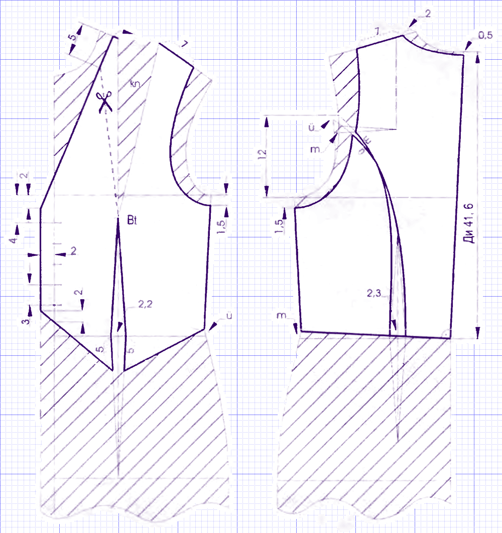 По переду также расширяем выкат на 1 см. От линии груди отмеряем вверх 2 см. Через полученные точки проводим вогнутую лекальную линию борта и продлеваем её за центр полочки на 1,5 см. Прочерчиваем фигурную линию низа – размеры см. на чертеже.