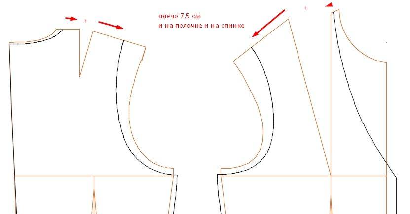 По плечевой линии отмеряем длину плеча 7,5 см и проводим новую линию проймы.