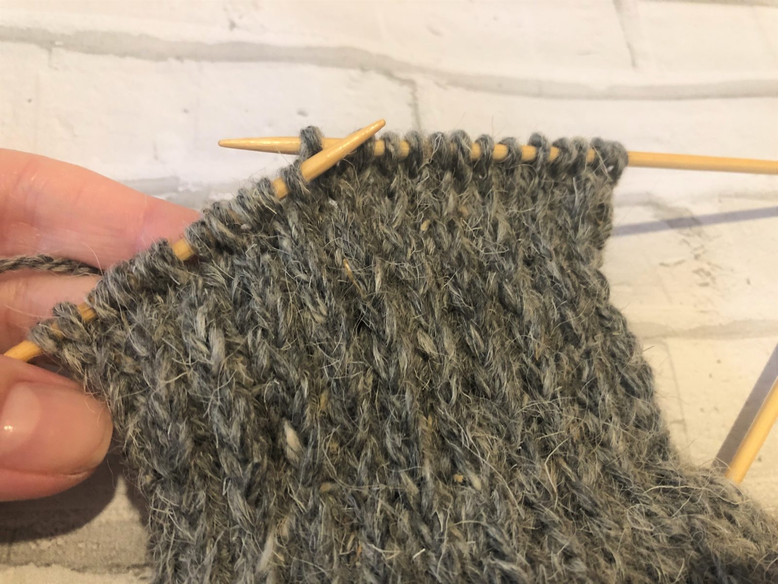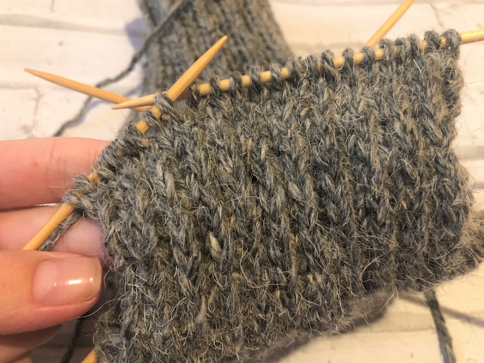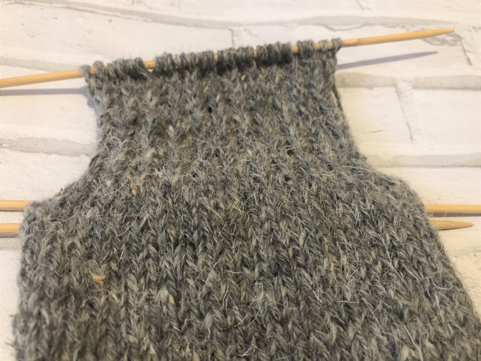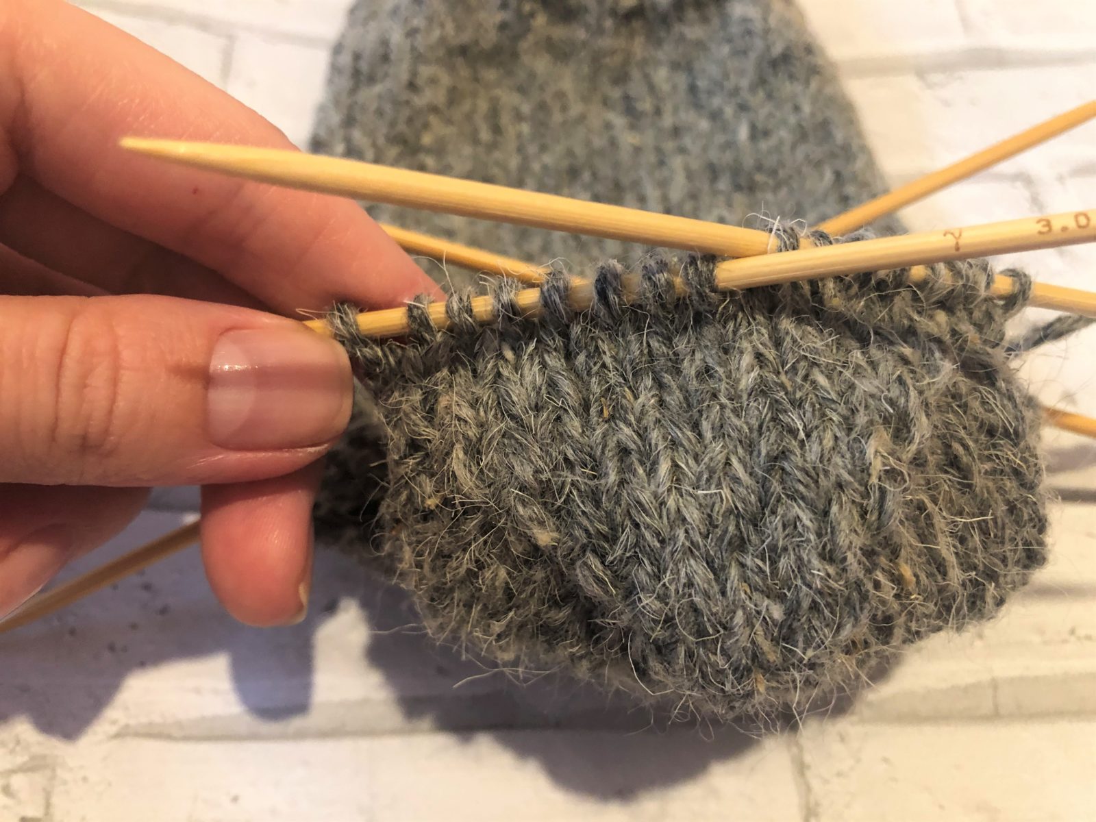 - Кончик от набора петель смотрит внутрь ноги. В этом случае пятка правого носка будет начинаться с изнаночного ряда (кончик смотрит влево). А левого – с лицевого (кончик от набора петель справа). При этом спереди и сзади носок будет без «зазоров».
