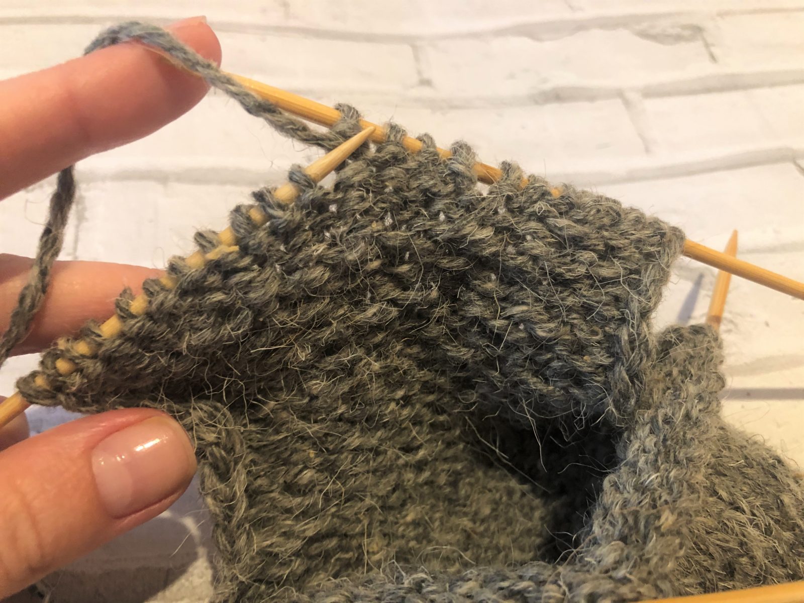 Так мы и определяемся, где верхние спицы, а где нижние. Пятка вяжется на нижних двух спицах.