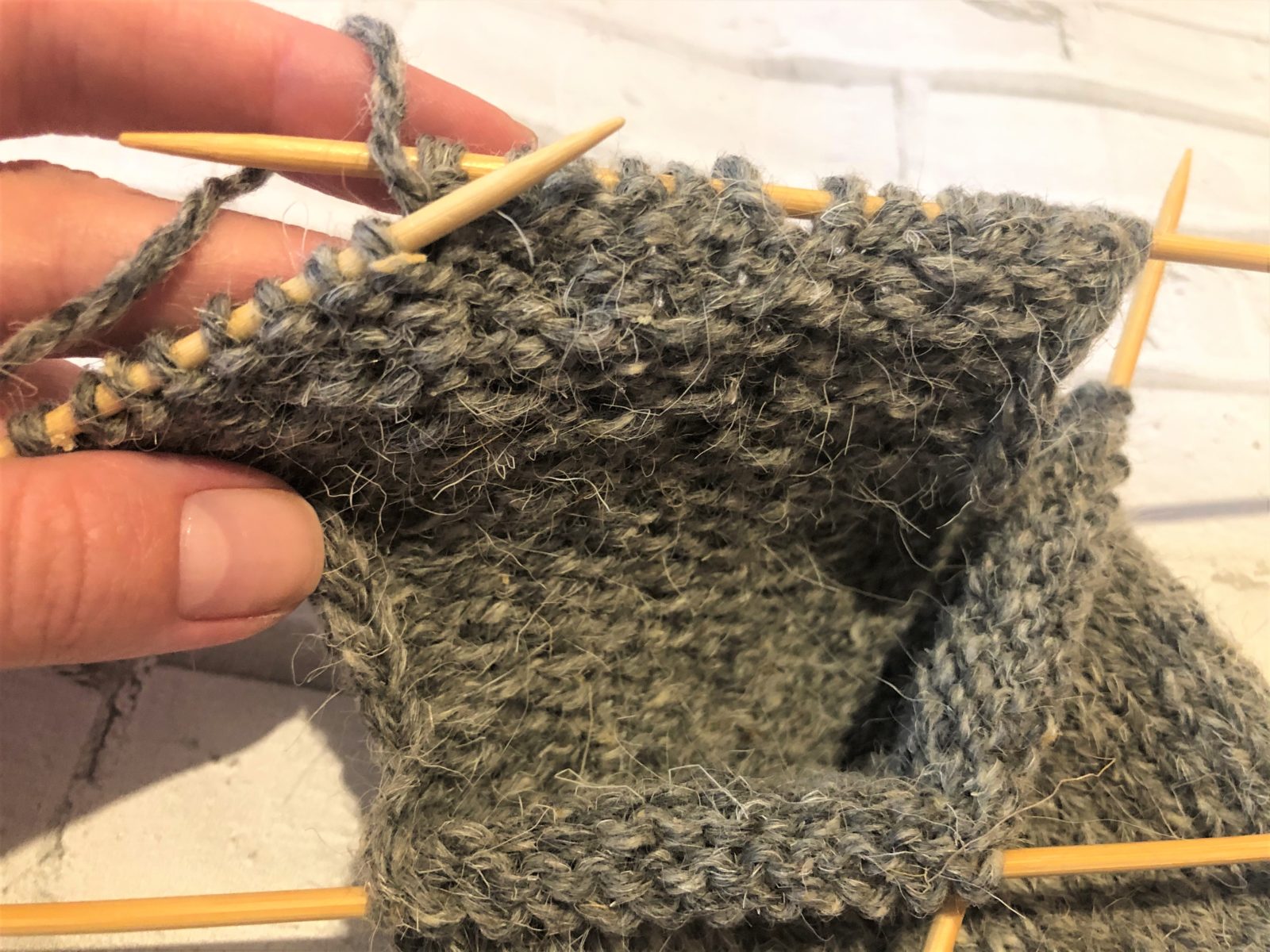После того, как мы провязали вторые 16 петель, подходим к высоте пятки. Из ее кромочных петель нужно поднять петли.