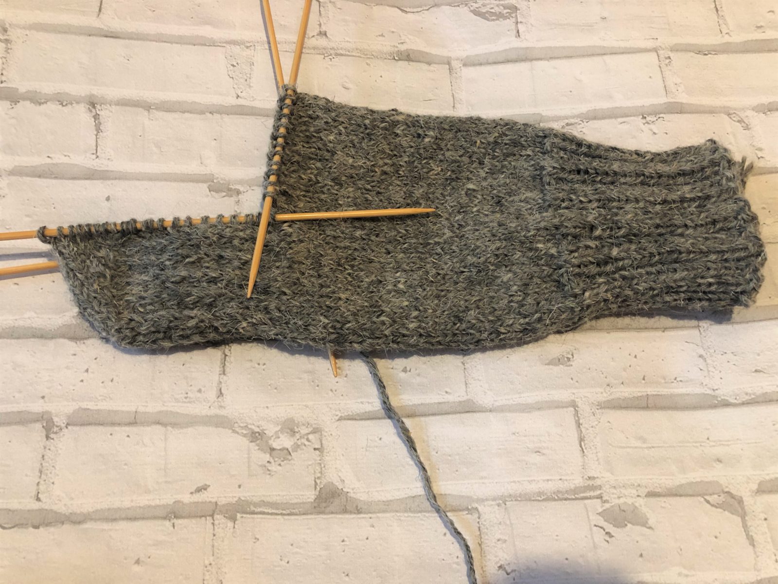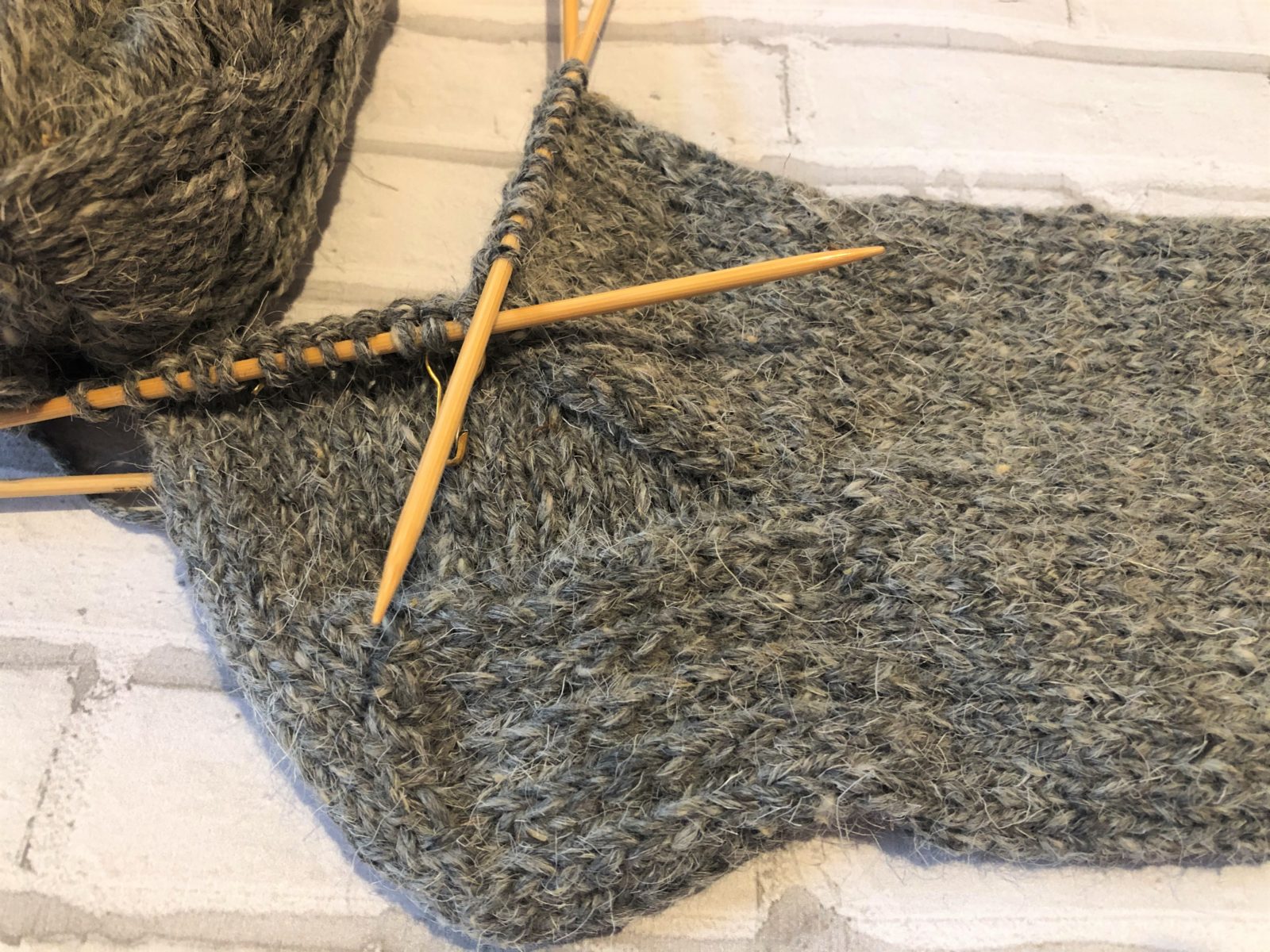 Достаем недостающую спицу. Теперь в вязании носка снова участвует 5 спиц. На рабочей спице 32 петли. Вяжем 16 из них на одну спицу, 16 – на вторую.