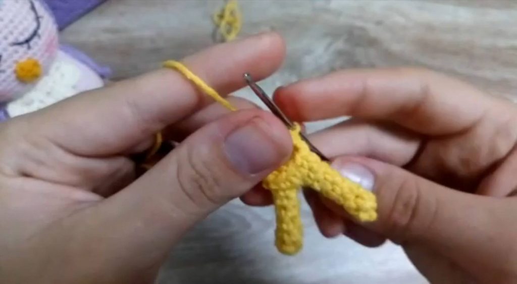 1-й р.: Жёлтой пряжей 3 СТБН в КА 2-й: 3 СТБН (3) 3-й и 4-й ряды: как 2-й. Отрезать нить.
