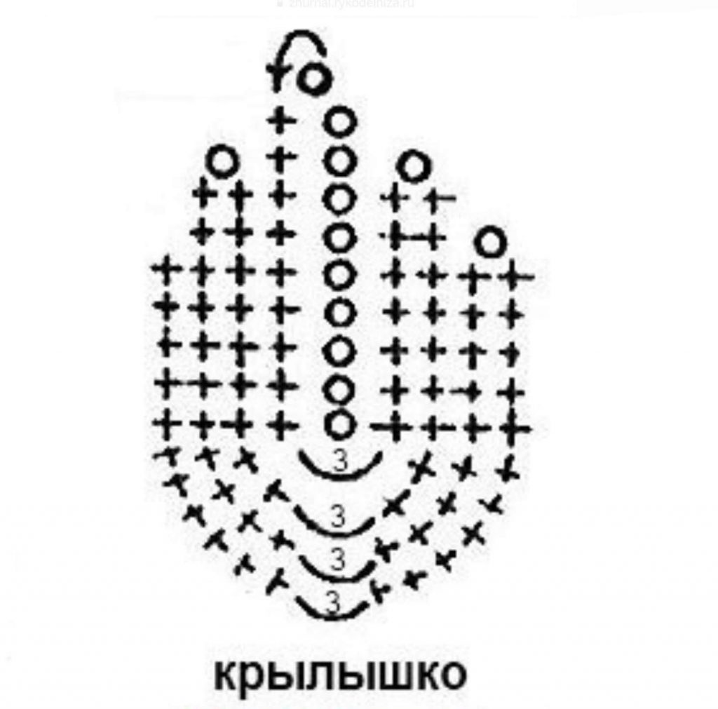 Внешняя сторона: выполняем так, как внутреннюю, но после 34-го р. нить не обрезаем, а складываем внешнюю и внутреннюю стороны и обе детали в 35-м круг.р. обвязываем вместе. Крыло левое выполнено аналогично, в зеркальном отражении.