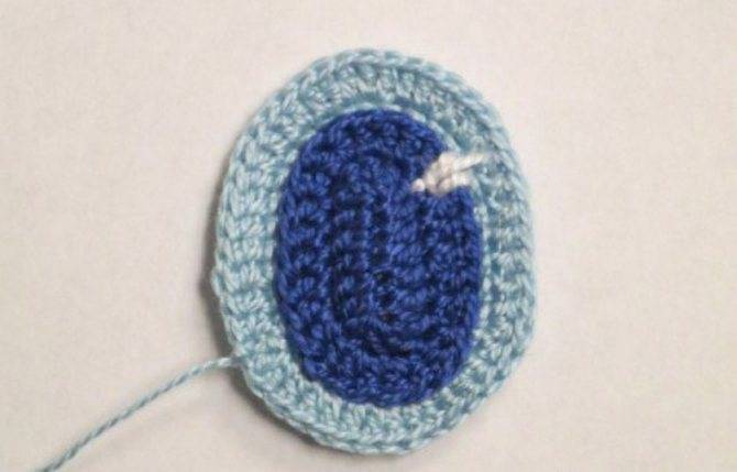- Захватывая один ряд петель по бокам и внизу, голубыми нитками вышить радужку. Верхний ряд не трогать. Используется прием «валик», при котором нити ложатся очень близко друг к другу, но не перекрывают одна другую.