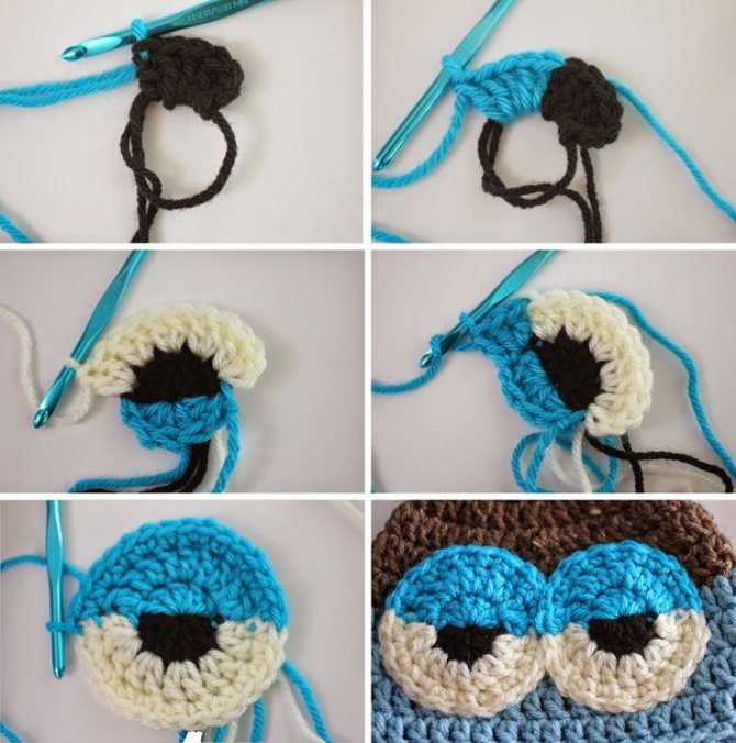 Во-вторых, крючком отдельно вяжутся плоские рисунки глаза, после чего присоединяются к игрушке (опять-таки или приклеиваются, или пришиваются). Удобен такой вариант тем, что сразу изготавливается глазик из разноцветных ниток. Если используется готовая схема, то главное не забыть сделать детали симметричными.