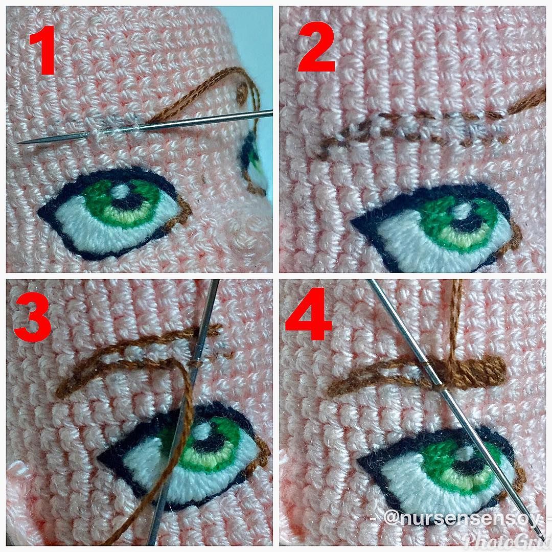 Последний штрих – брови коричневой нитью. Выполняются двумя длинными стежками.
