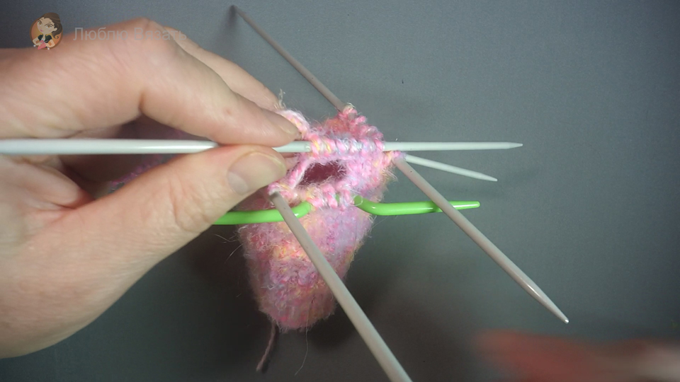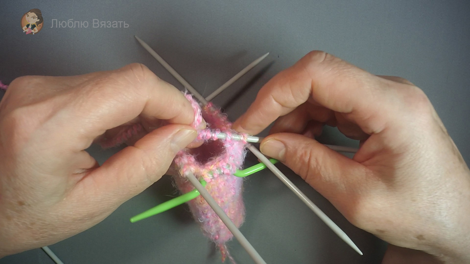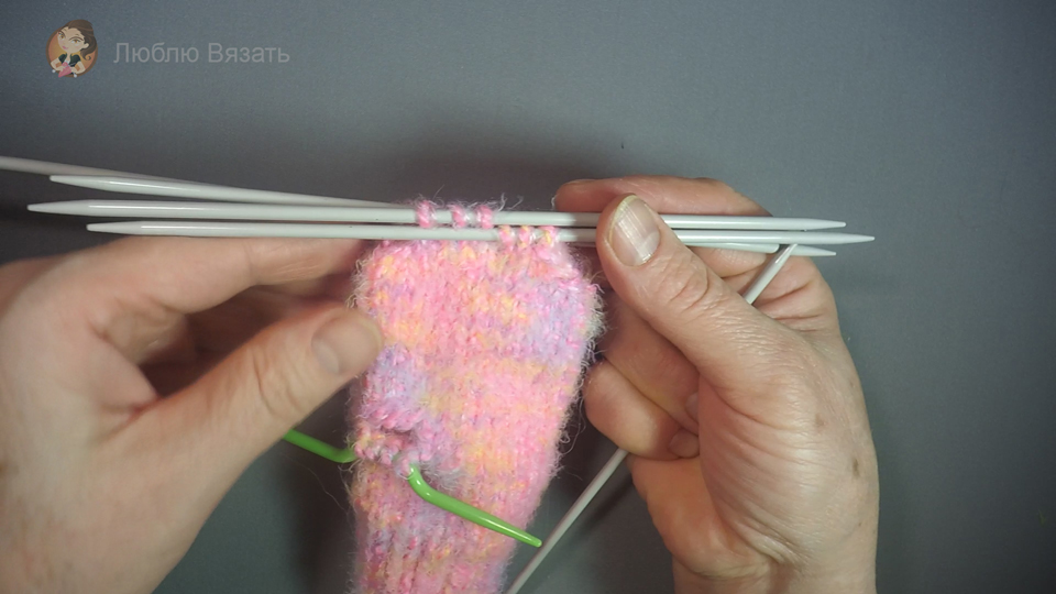 После окончания основной части, возвращаемся к большому пальчику. Переносим петли с булавки на спицу, добавляя петли так, что бы общее количество было кратно 3.