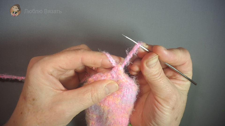 - Вязальный крючок вводится в столбик с любого места. Нитка вытягивается, обматывается, длинная петля оставляется за изделием.