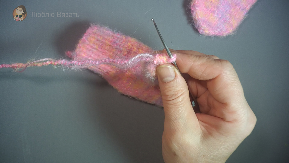 Через оставшиеся 4 петли крючком протягиваем петли. Завершаем, спрятав концы нити внутрь варежки крючком.