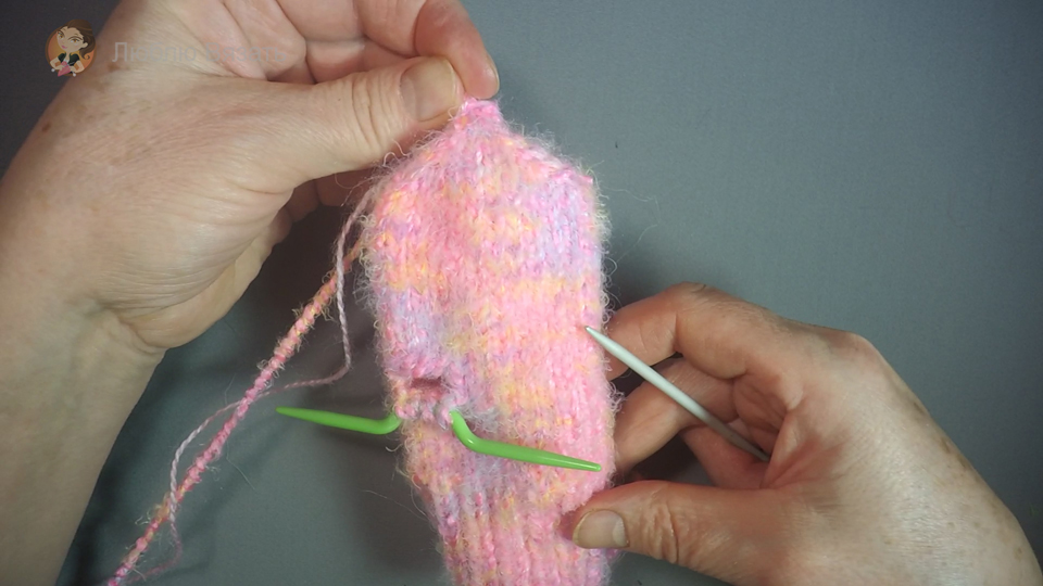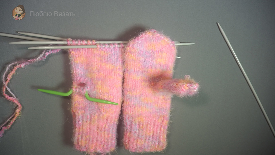 Вывязываем большой пальчик на варежке. Берем петельки, и довязываем до 16 п.