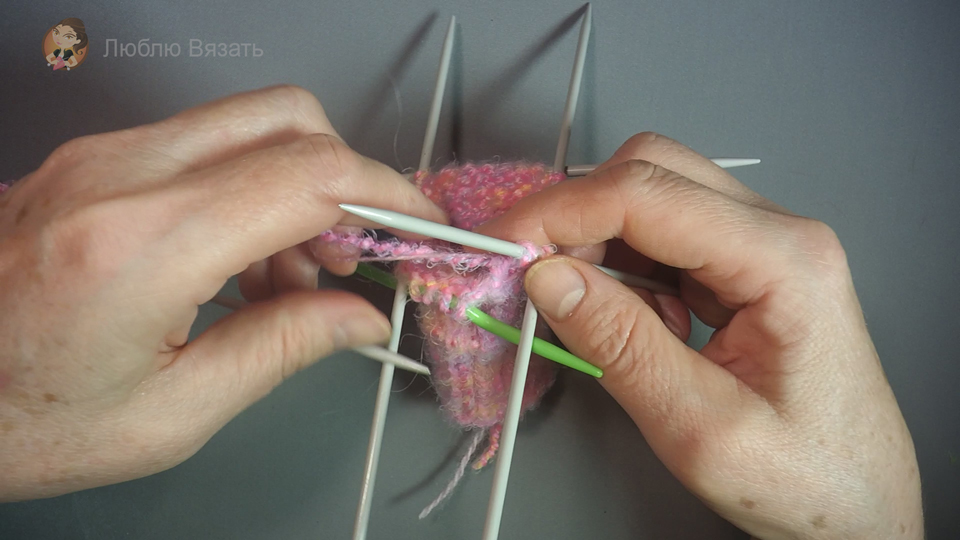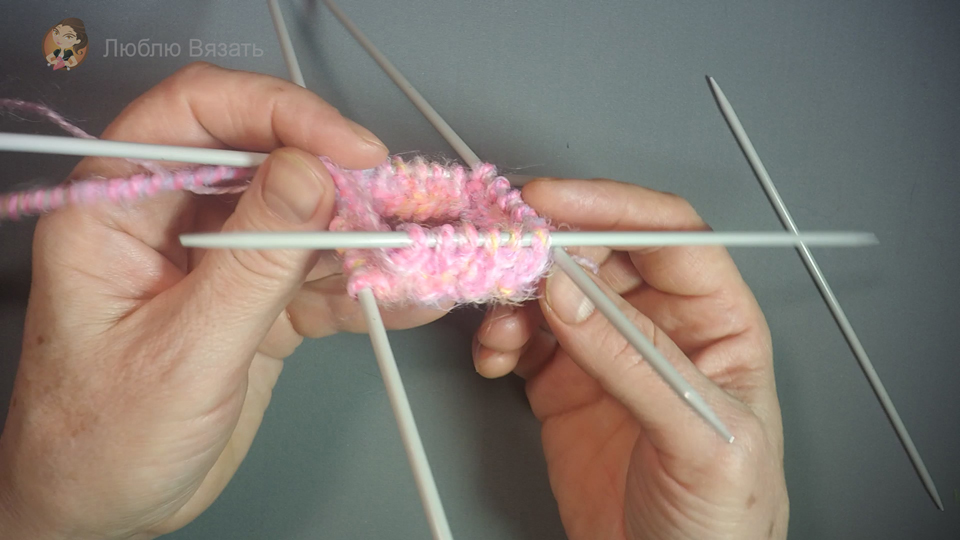 С помощью рабочей нити набираем на правую спицу недостающие 5-ть петель.