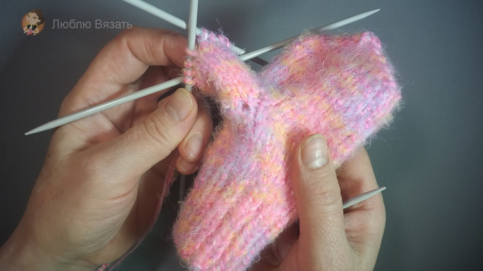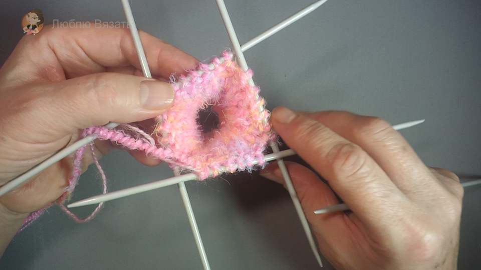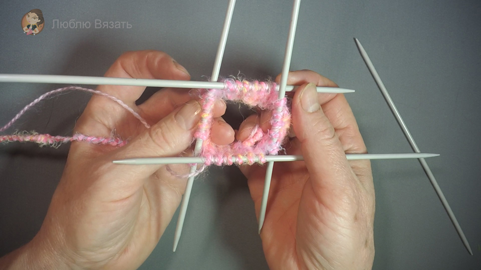Вяжем 11 рядов по кругу резинкой 1х1, чередуя лицевую и изнаночную петли. Сразу в первом ряду, поровну распределите вязание на четыре спицы. Таким образом, у вас должно получиться по 6 петель на каждой спице.
