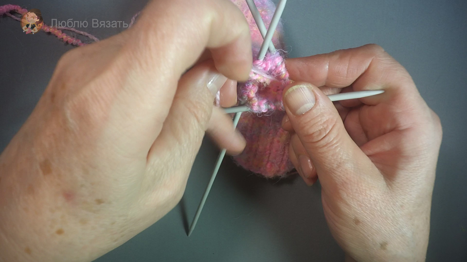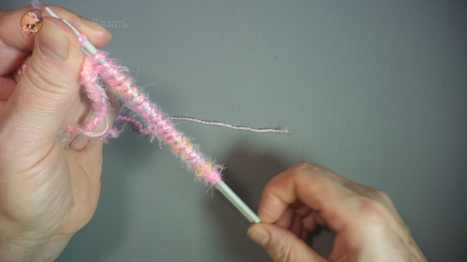 - Петелька оставляется за изделием, затем провязывается левой вязальной иглой.