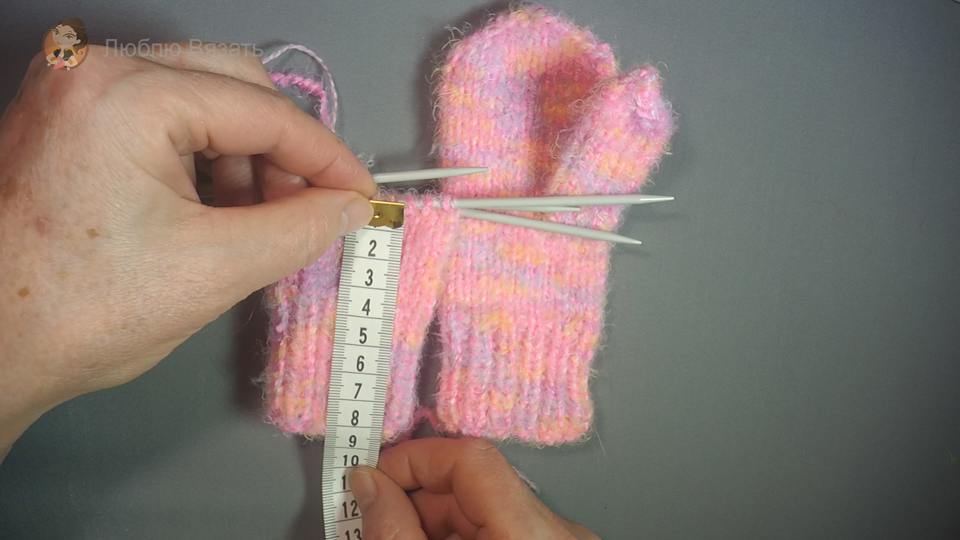 Продолжаем вязать по кругу лицевой гладью еще 13 рядов. Поскольку у всех деток ручки разные, для точности приложите работу к вашему ребенку. Соответственно на этом этапе рядов может быть как больше, так и меньше.