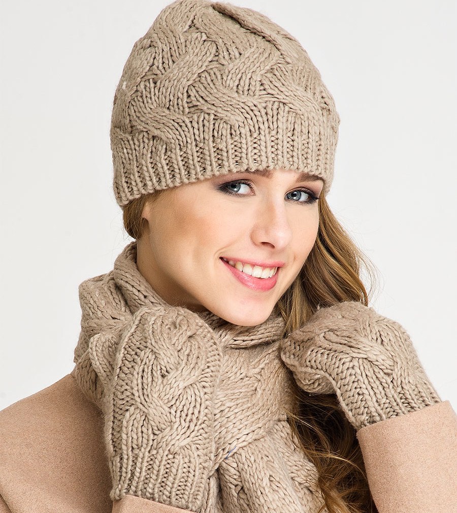 Комплект — шапка, снуд и варежки спицами — фото моделей: