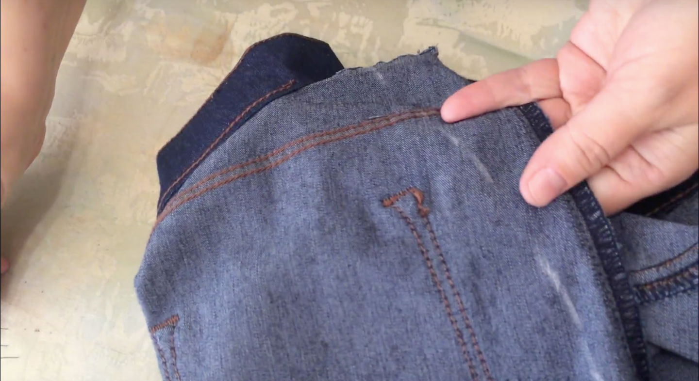 - В поясе отрезать лишнюю ткань, сшить его и пришить к джинсам.
