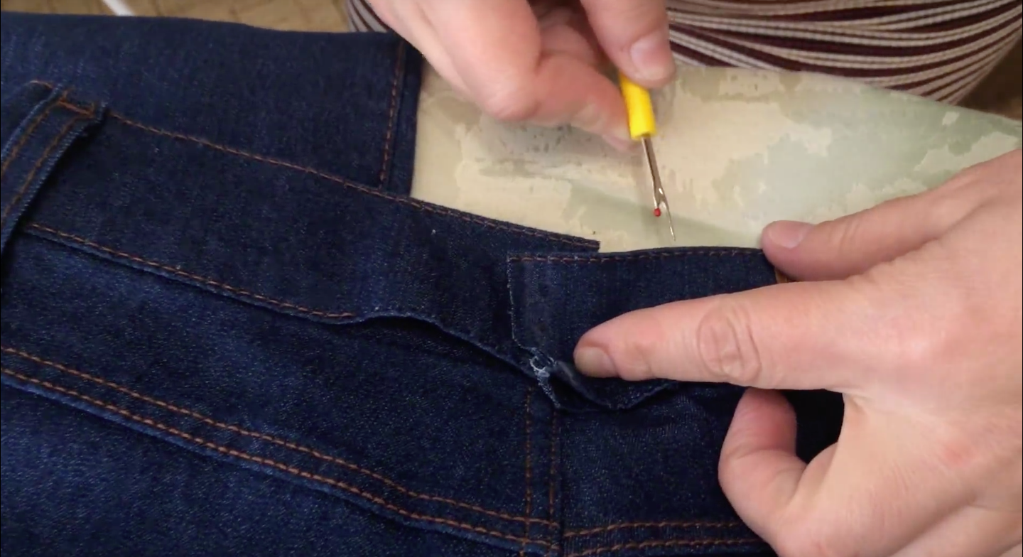 Если нужно убрать лишних пару сантиметров, можно просто перешить по серединному шву сзади. Процедура практически ничем не отличается от предыдущей, только отпарывание пояса осуществляется в ином месте. Также убрать на время придется шлевку. Распускается лишь один шов, что упрощает процедуру.